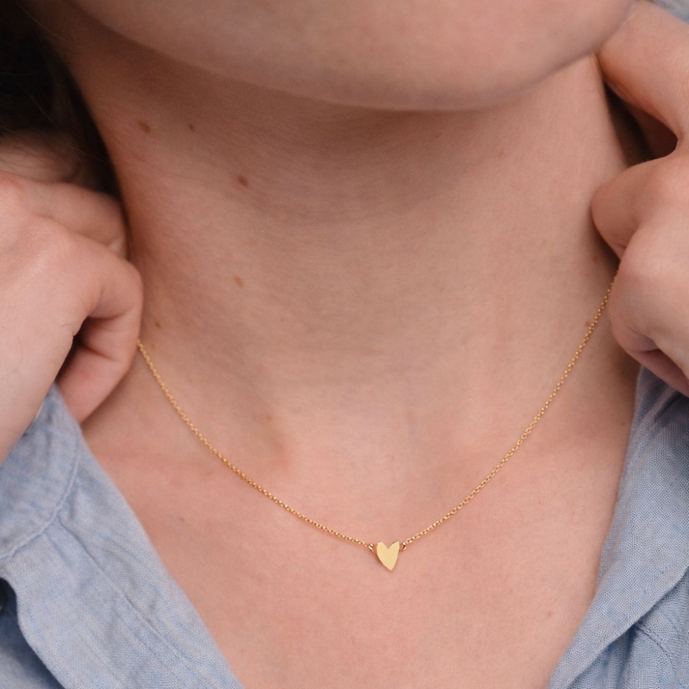 Its small gold heart pendant rests on a fine, luminous chain, creating an elegant everyday piece with a delicate emotional touch.