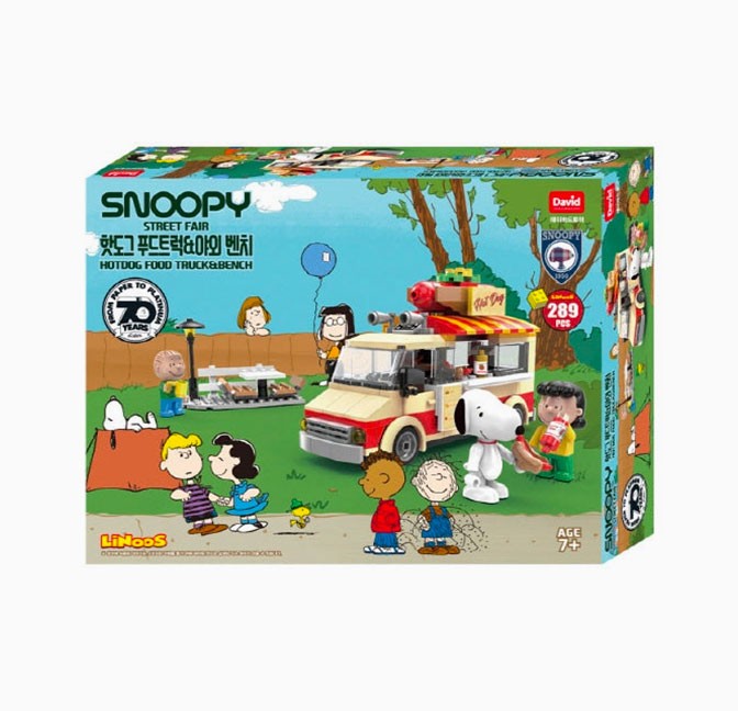 Bring the joy of a classic street fair to life with the Snoopy Street Fair & Hot Dog Truck construction set! This 289-piece kit features beloved Peanuts characters Snoopy, Charlie Brown, and Lucy, enjoying a fun food truck experience. The set includes a detailed hot dog truck with opening elements, a park bench scene, and various playful accessories that capture the lively atmosphere of a street fair.